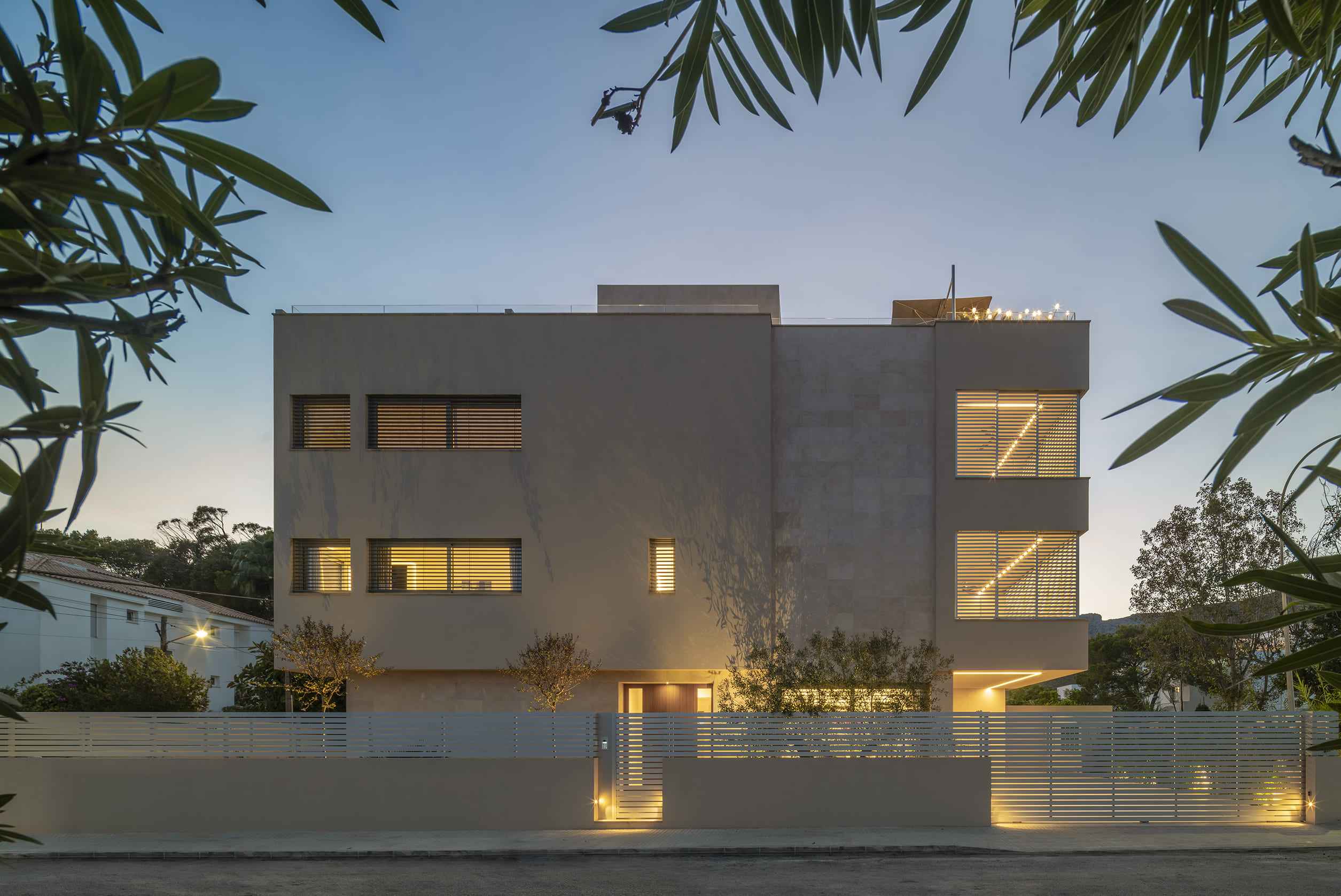 La fachada combina piedra caliza de Binissalem con zonas aplacadas en piedra de Santanyí. El cerramiento se reviste con aislamiento térmico por el exterior, evitando puentes térmicos y garantizando confort todo el año. La carpintería exterior de aluminio Schüco dibuja huecos nítidos. Dentro, pavimentos y alicatados de gres porcelánico de alta gama dialogan con una carpintería interior de roble lacada. Los paramentos de cartón yeso con perlita de alta dureza y resistencia a la humedad completan una base técnica impecable que nunca se impone.